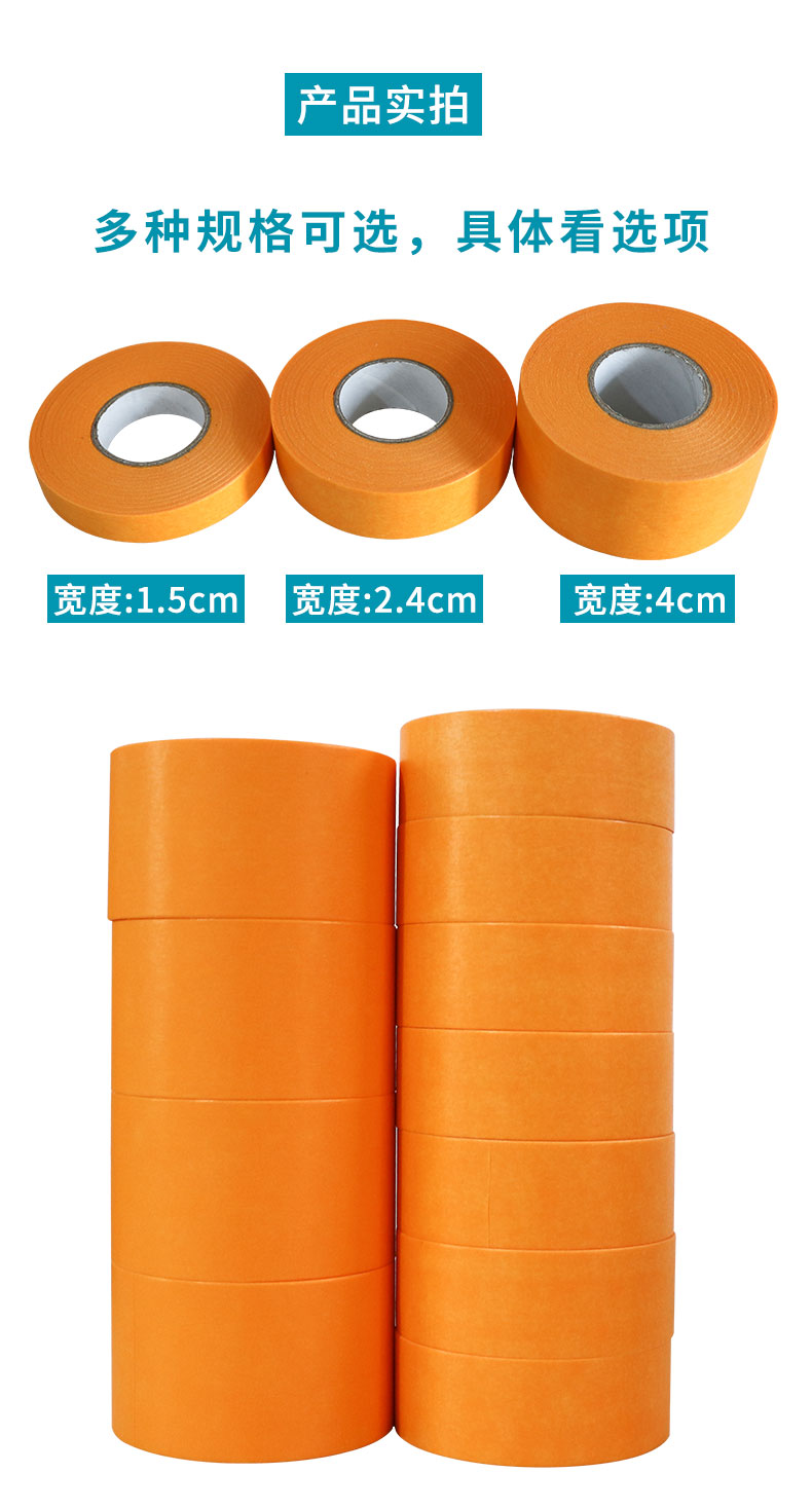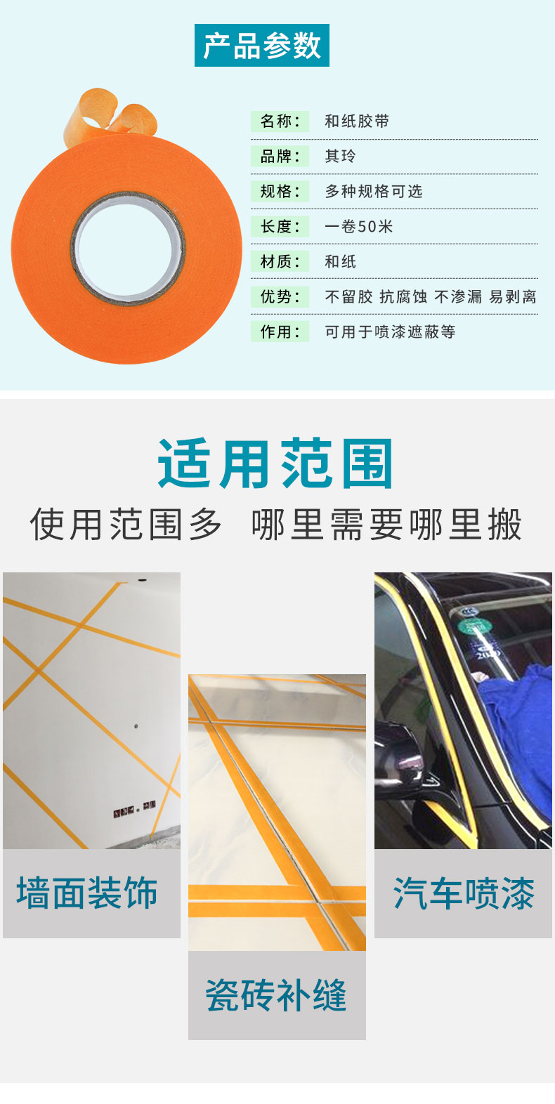- 采用和紙為基材,紙質柔和,適合運動器材、橡、塑膠部件及建筑工地、室內、外裝潢、裝修噴、刷油漆時遮蔽用途。粘性適中,對大多數(shù)的平滑表面、彎曲或轉角處有很好的貼附性及遮蔽性,作業(yè)性良好,使用后快速撕除,不留殘膠。