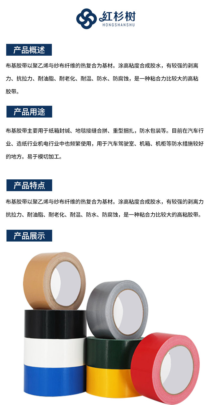 - 布基膠帶以聚乙烯與紗布纖維的熱復(fù)合為基材。經(jīng)過(guò)涂高粘度合而成膠水,之后并與雙面離型紙通過(guò)復(fù)合而成?;寄z帶有較強(qiáng)的剝離力、抗拉力、耐油脂、耐老化、耐溫、防水、防腐蝕,是一種絕緣的高粘膠帶。