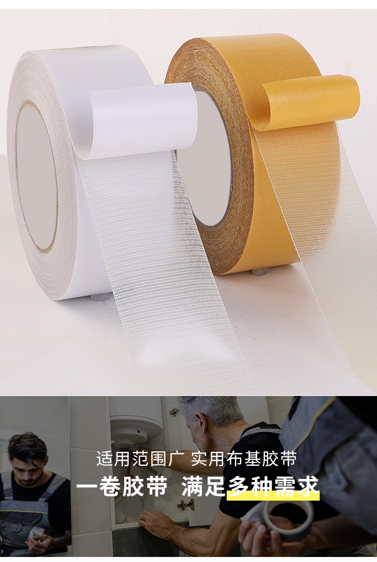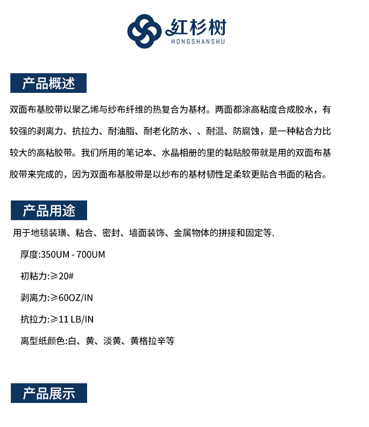 - 以易撕紗布纖維為基材,涂高粘度熱熔雙面膠,并與雙面離型紙復(fù)合而成。具有穩(wěn)定的雙面粘性、拉力強(qiáng)度大、粘力強(qiáng)、剝離力高的特性 主要的用途:用于地毯裝璜、粘合、密封、墻面裝飾、金屬物體的拼接和固定等.
