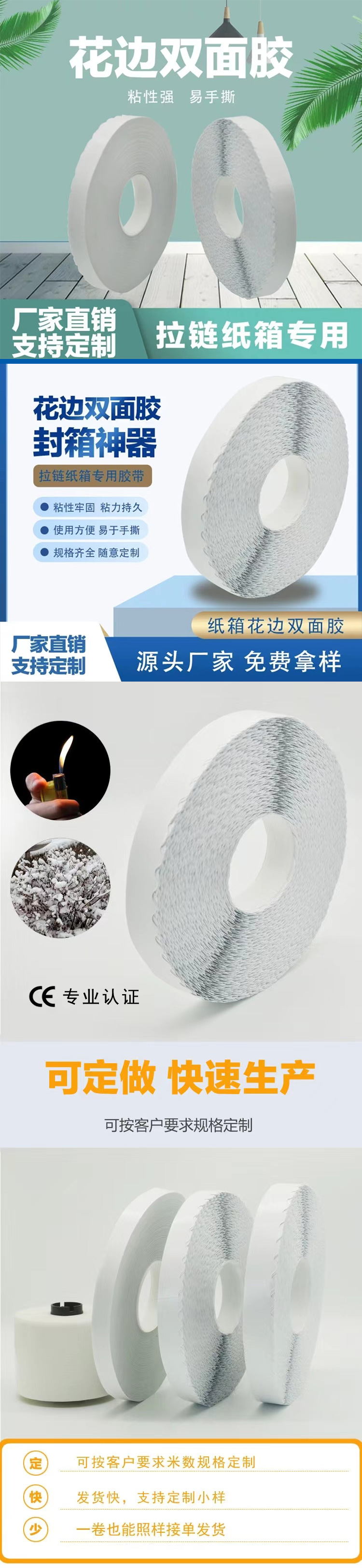 - 波浪紋鋸齒膠帶是以棉紙為基材,在其兩面涂上高粘的感壓性膠水,再覆以易剝的離型材料而成。是一款做了留邊處理定制易于撕拉離型紙貼合的雙面膠帶,400米的大卷更加適合現(xiàn)代流水線自動(dòng)化設(shè)備的粘合。