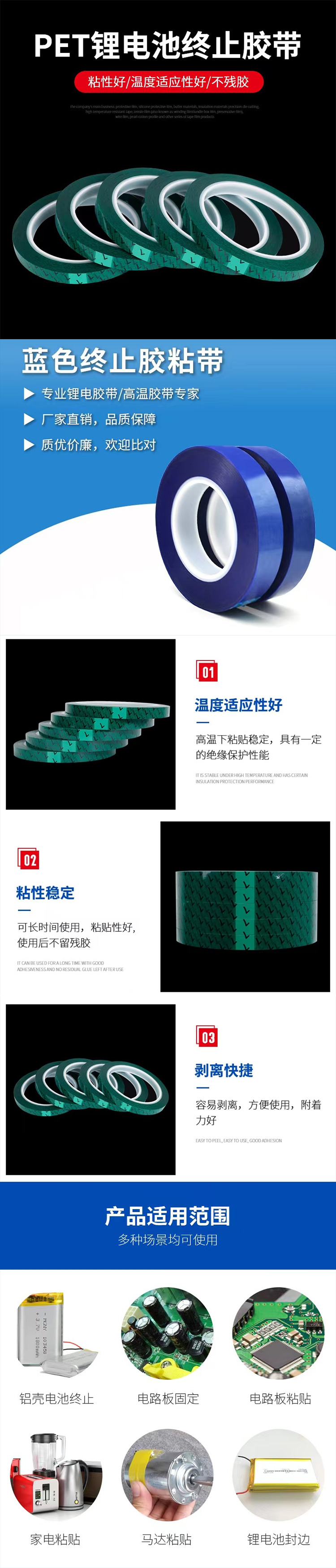 - 終止膠帶是采用聚丙烯、聚酯或聚酰亞胺等絕緣材料為基材,在此基礎(chǔ)上涂上耐鋰電池電解液專用丙烯酸膠水,厚度為0.019-0.045顏色為深綠色、草綠色、翠綠色、墨綠色、藍色、黃色,耐電解液,電氣絕緣性高、耐壓耐候、阻燃,具有合適的粘著力和貼服性以及再剝離不殘膠等特性。